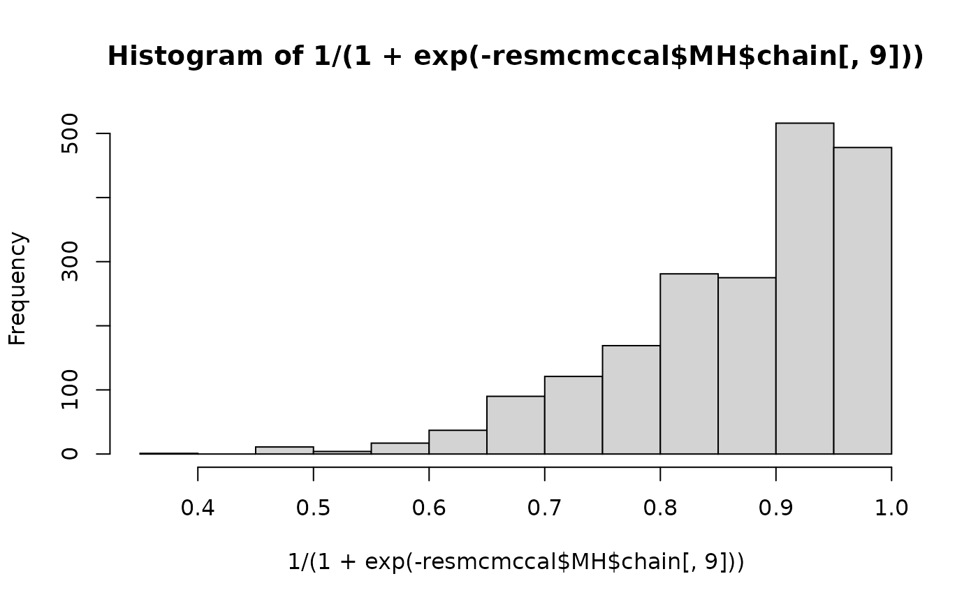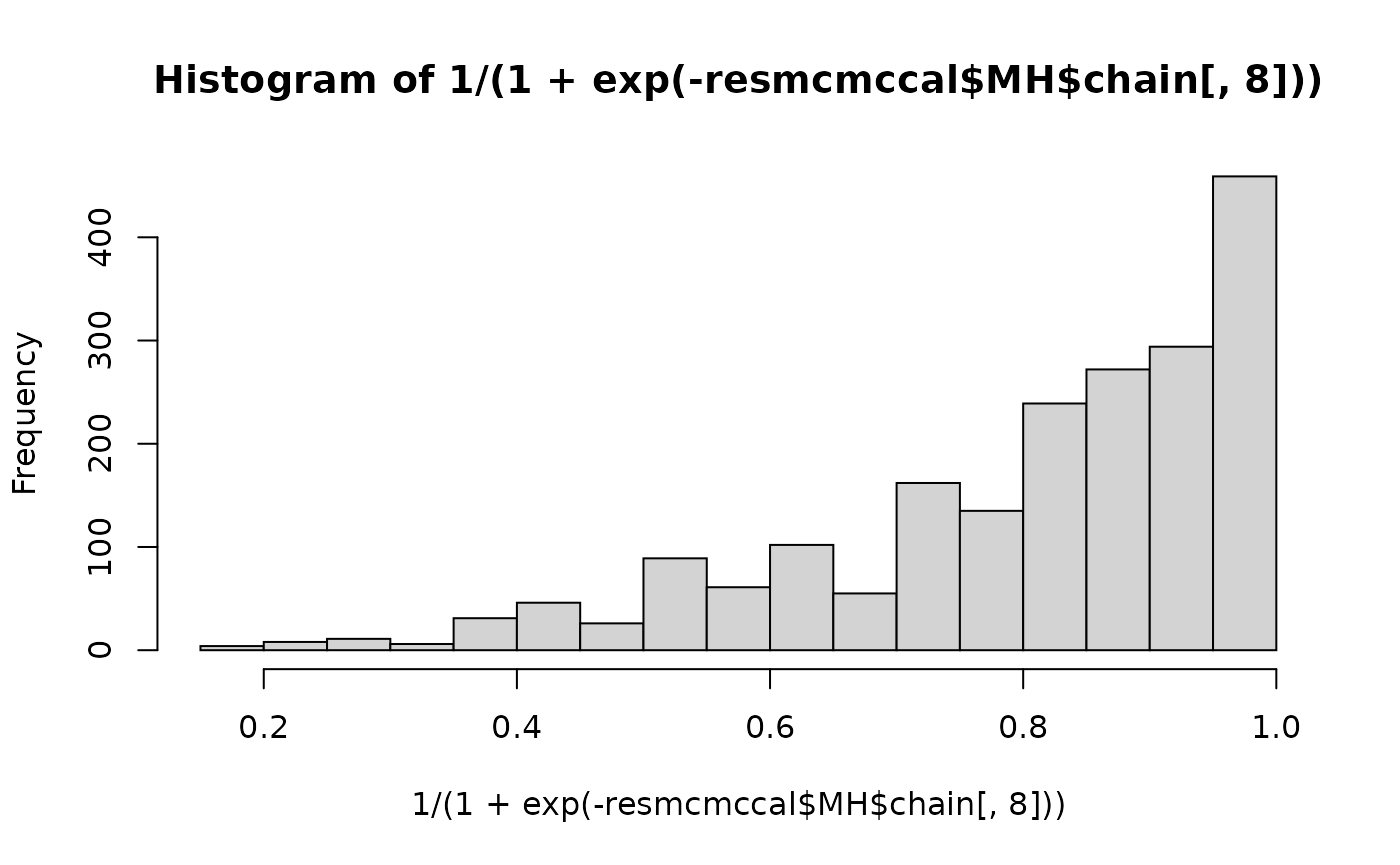 resmcmccal <- MCMC(nMWG,nMet,parwalkinit2,init2,Rexp,tdistFULL,1.9,parprior,TRUE,calibration2)The sampling is done with a Metropolis within Gibbs algorithm and then with a Metropolis algorithm. From the MwG algorithm, a covariance matrix is derived for the random walk in the upcoming Metropolis algorithm. Some adaptations are performed to set the exploration step. Note the number of iterations are really low in this vignette to limit its compilation time.