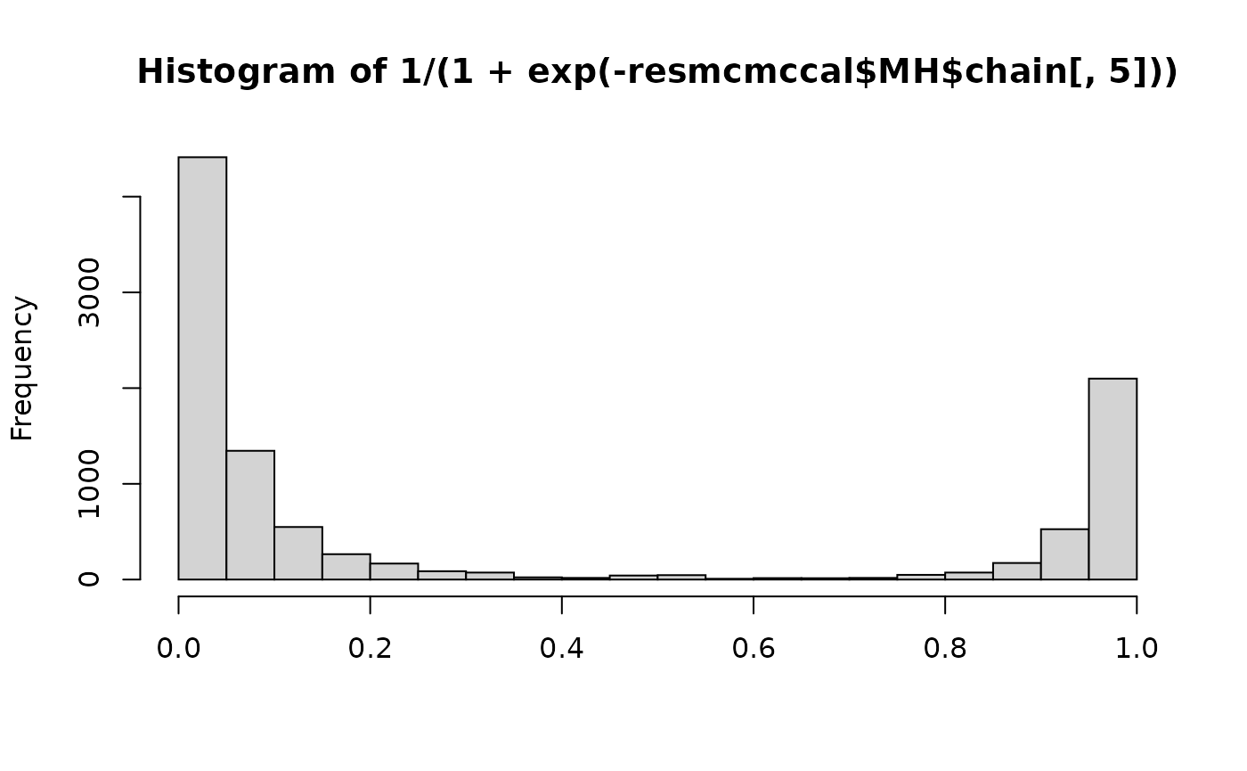 hist(1/(1+exp(-resmcmccal$MH$chain[,5])),xlab=expression(theta))